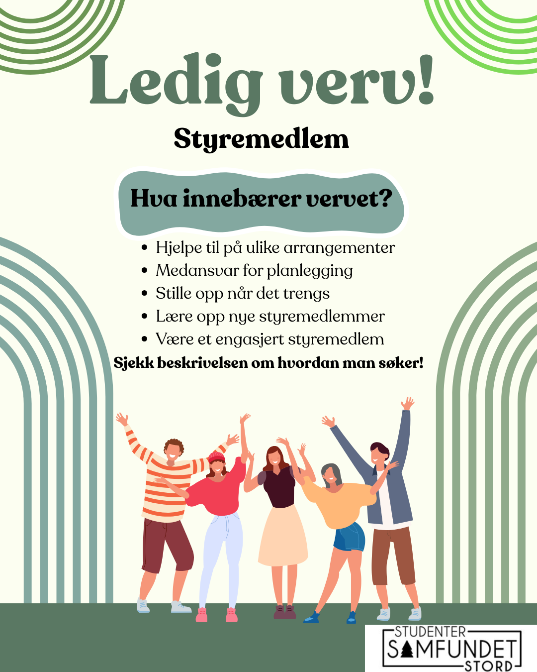 Studentersamfundet Stord Har du lyst på et verv i Studentersamfundet?Søk nå ved å følge ut skjema under! Søknad Bli kjent med oss! Om oss Halvtårshjul 2026 Arrangement Instagram Kommende arrangement Mer info Mer info